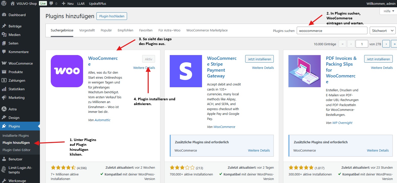Ein Shop machen (Screenshots) 1.) Für ein Shop wird ein Plugin benötigt. 1.) WooCommerce-Plugin für Shop aktivieren (Screenshots)